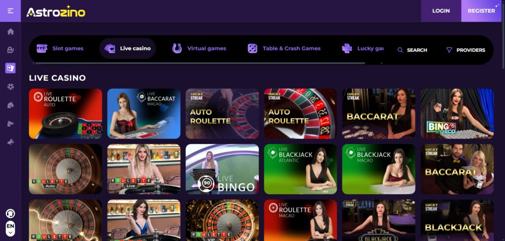 Astrozino Casino is built with a desktop layout that combines simple navigation with a modern look. At the top of the site, players can find quick access buttons for Login and Register, allowing both new and existing users to enter the site easily.