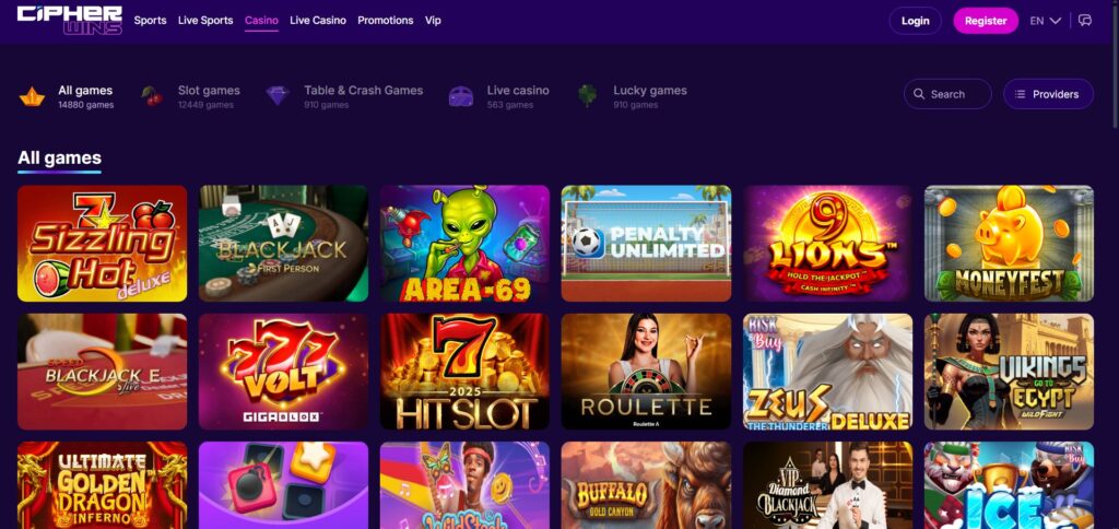 Cipherwins Casino hosts more than 14,800 games, offering a massive variety for every type of player. The collection includes slots, table games, crash titles, live dealer tables, and lucky draws.