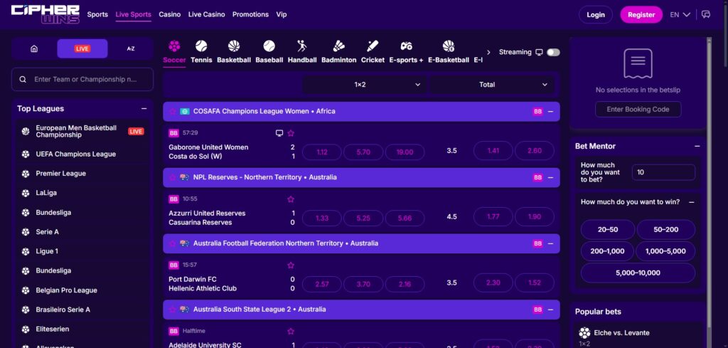 For players who prefer real-time betting, Cipherwins offers 3,000+ live sports events every day. Odds update dynamically as matches unfold, giving users the chance to place wagers during the action.