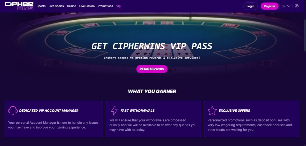 The VIP Club at Cipherwins Casino is designed for loyal players who want extra attention and benefits. Entry is based on playing activity, and once invited, members enjoy priority service. The program highlights include:
