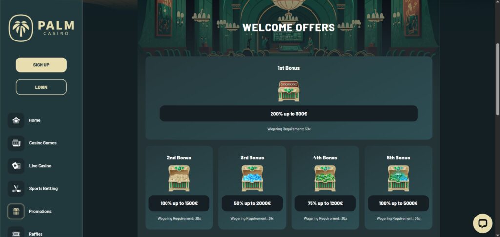 Palm Casino has a structured series of welcome offers that allow new players to start with strong rewards. Each stage of the bonus package has a clear percentage match and maximum amount, giving players a transparent view of what they can claim. The wagering requirement for all stages is set at 30x, which applies consistently across the package.