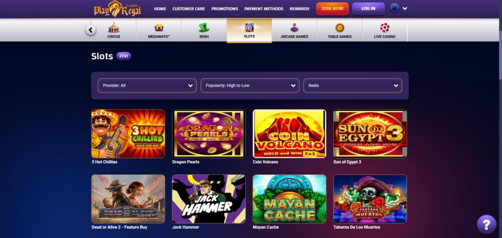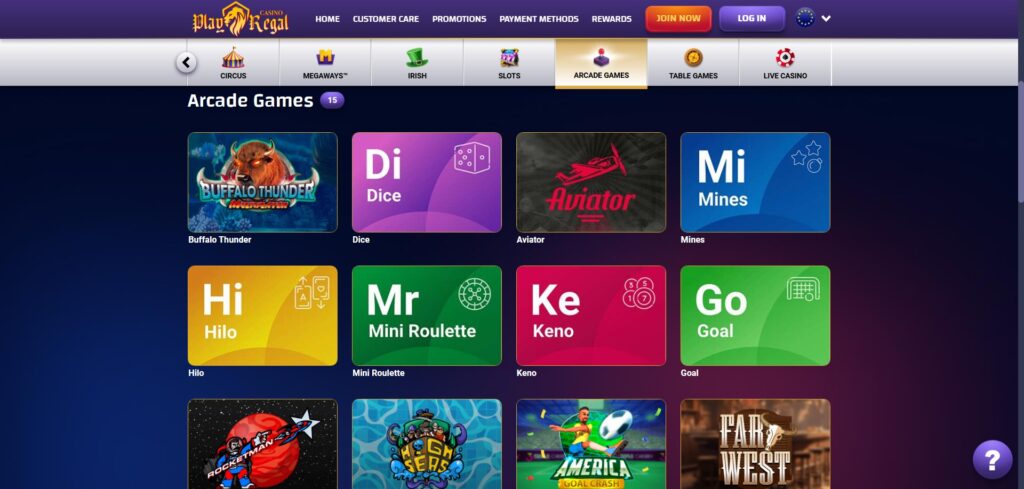 Play Regal Casino’s desktop version is designed to be clear and easy to use. The layout places the most important sections at the top, while the footer covers technical and policy information.