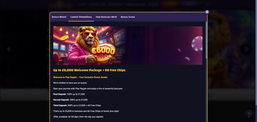 In this review, you will find all the main details about Play Regal, including its bonuses, security, payment limits, pros and cons, and more. We will also explain how to claim the welcome offer worth up to £6,000 plus 60 free chips across your first three deposits.