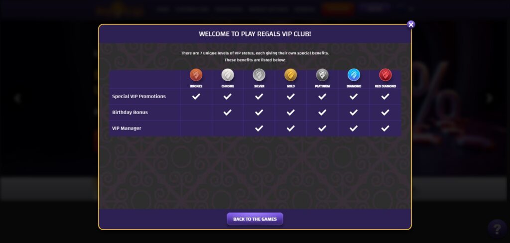 Play Regal’s VIP programme comes with multiple levels, each offering different perks. The levels are Bronze, Chrome, Silver, Gold, Platinum, Diamond, and Red Diamond. As you progress, you unlock: