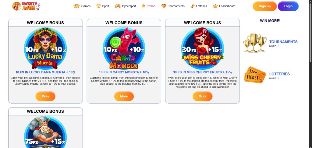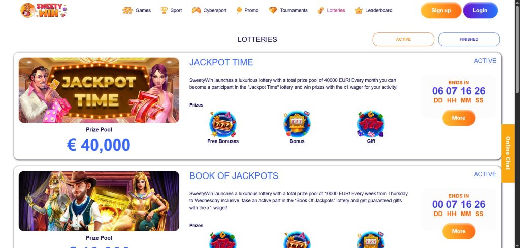 Currently, Sweety Win Casino does not run active tournaments. Players can still benefit from lotteries, welcome bonuses, and leaderboard prizes, with possible tournaments expected in the future.