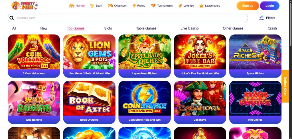 Sweety Win Casino highlights its most popular titles in the Top Games section. These are well-known slots that attract regular attention thanks to their mechanics and bonus features.